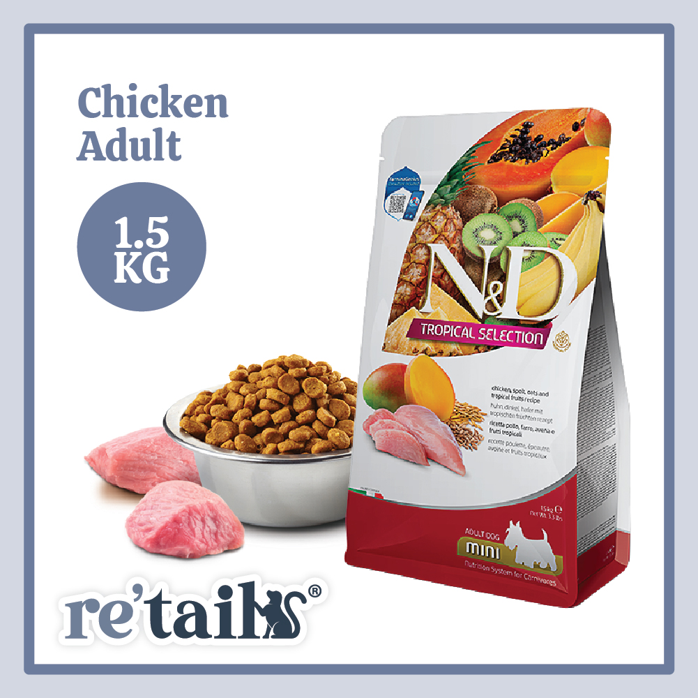 Discover the exotic allure of Farmina N&D Tropical Selection mini dog dry food, a premium dry kibble crafted specifically for small-breed adult dogs. This nutrient-dense formula features high-quality animal proteins like fresh chicken, salmon or lamb as the first ingredient, delivering a minimum of 90% of its protein from animal sources for optimal muscle maintenance and energy.